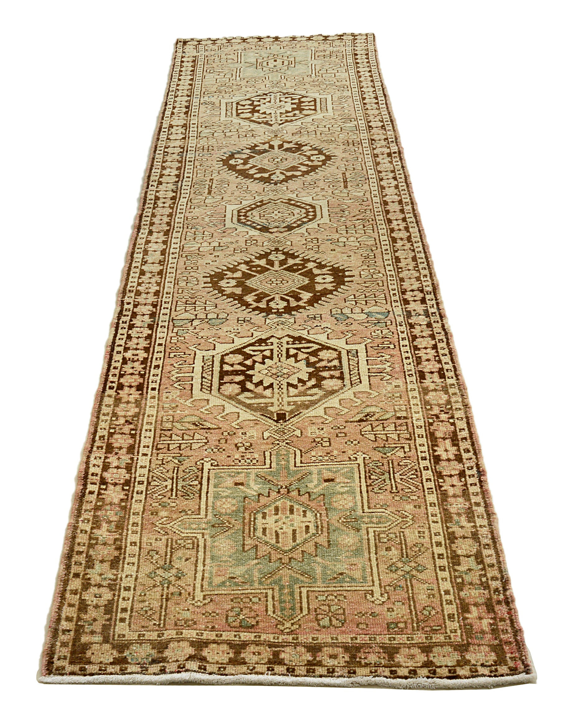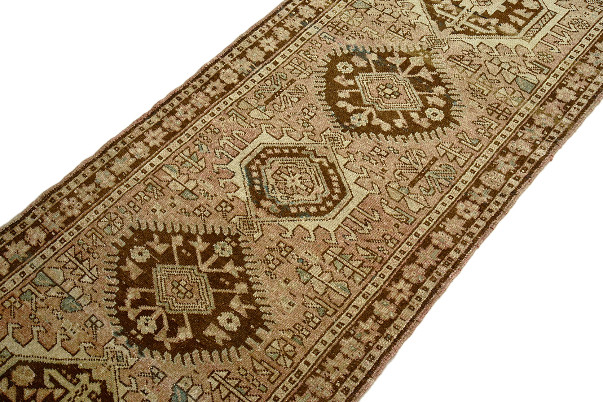 A classic antique Persian Heriz runner featuring bold geometric medallions and a warm, earthy palette of sand, walnut brown, and muted blue. Hand-knotted with durable wool, this runner offers a strong architectural presence while remaining balanced and refined.