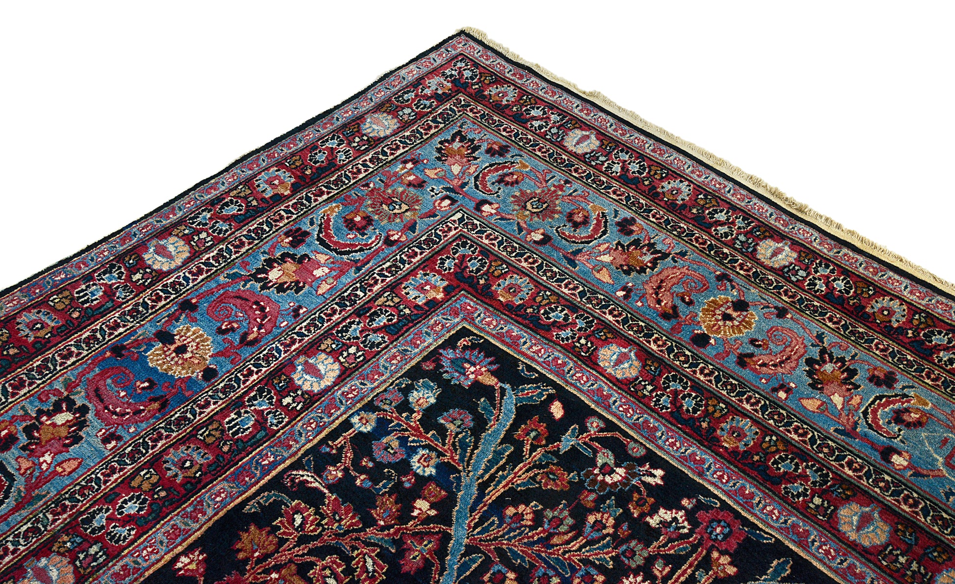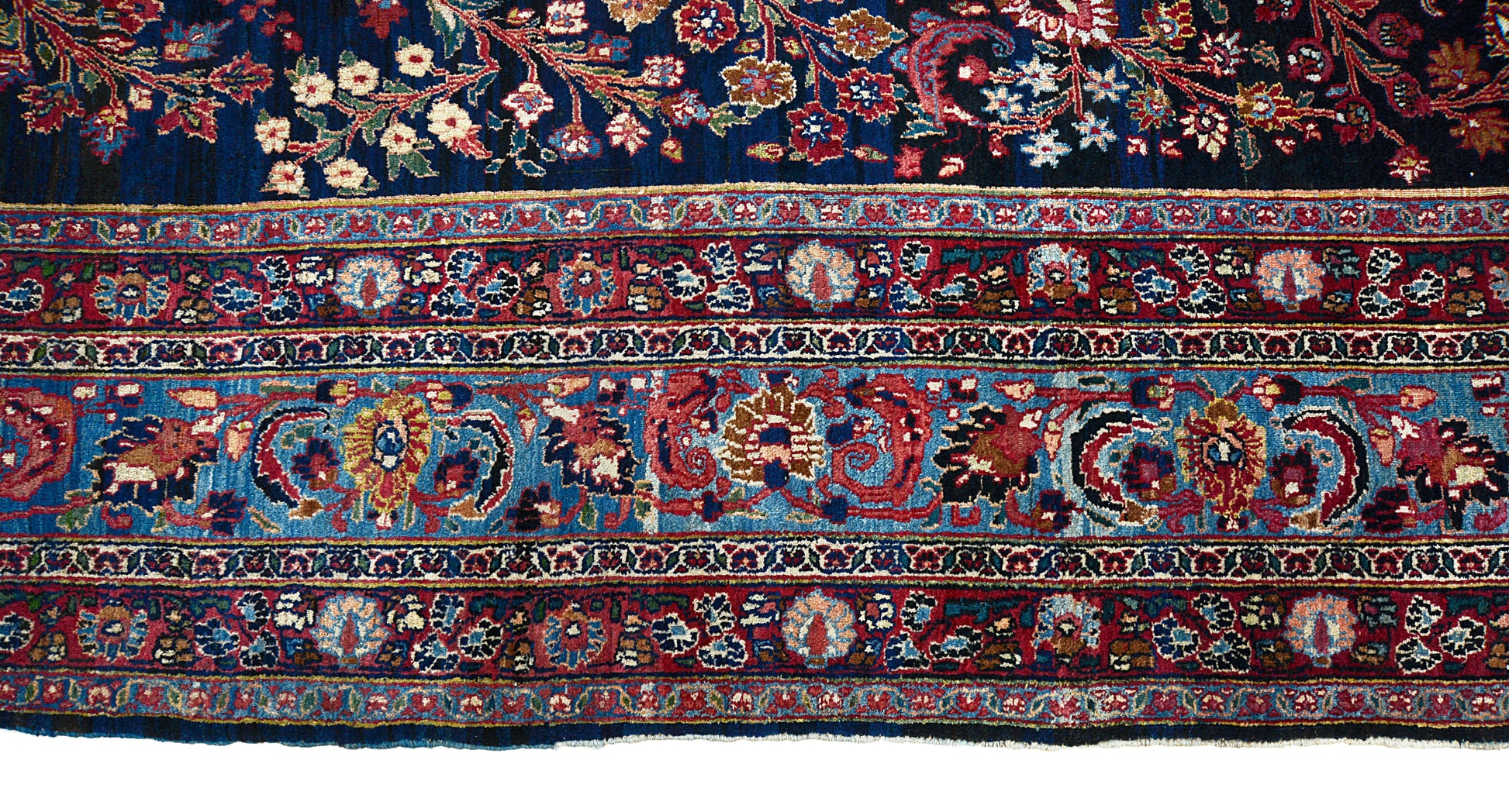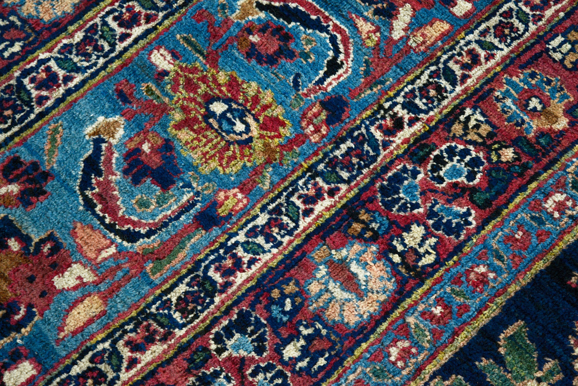 An authentic antique Persian Mashhad carpet, hand-knotted in northeast Iran circa 1915. This elegant piece features a deep indigo-blue field with an intricate all-over floral design, framed by a wide decorative border in warm reds, ivory, and soft blues. The fine drawing and rich natural dyes have aged beautifully, giving the carpet a calm and refined presence.