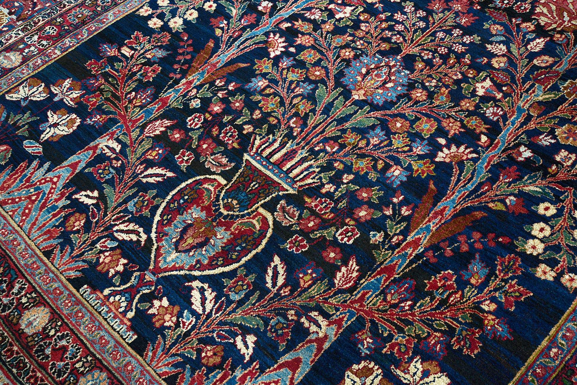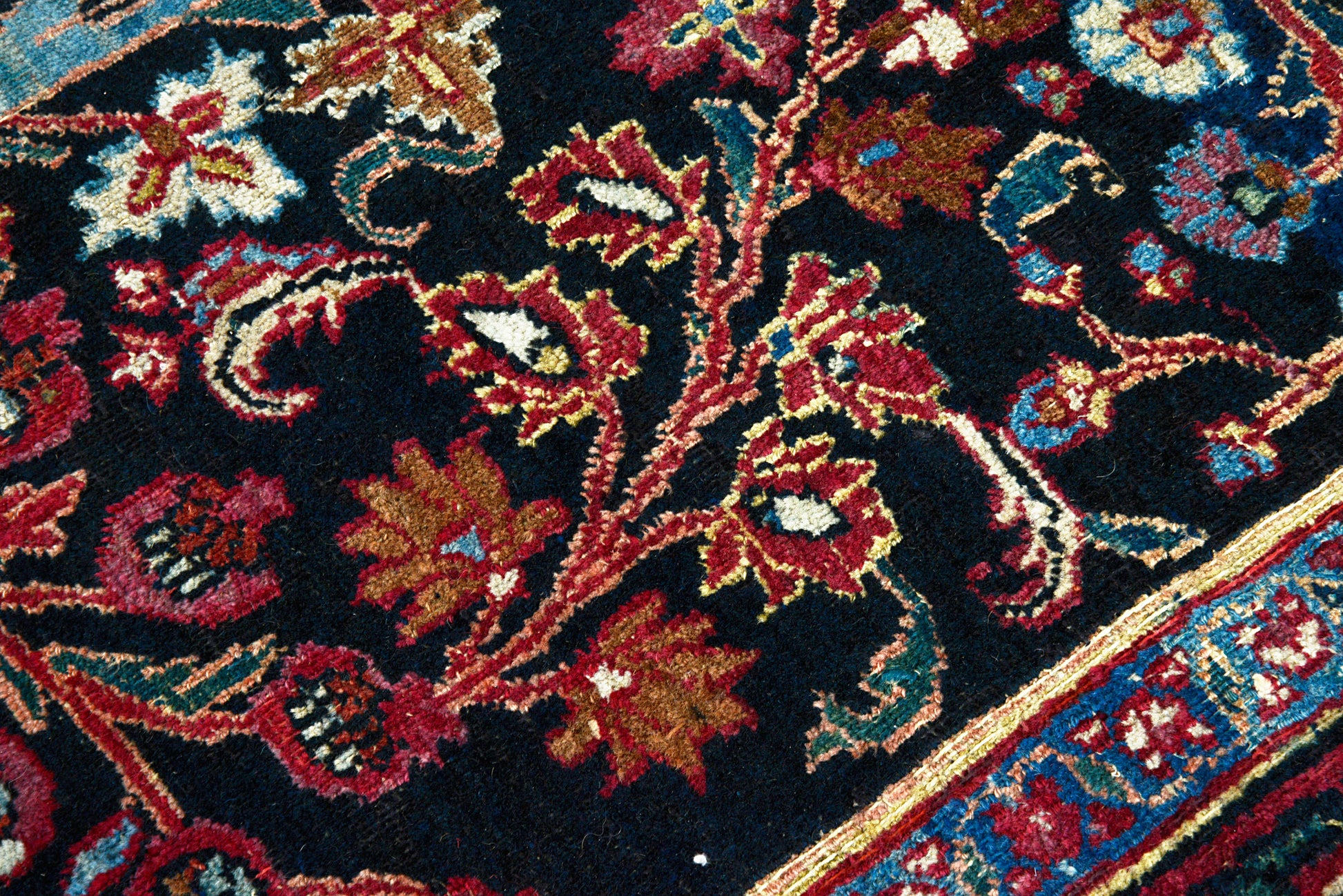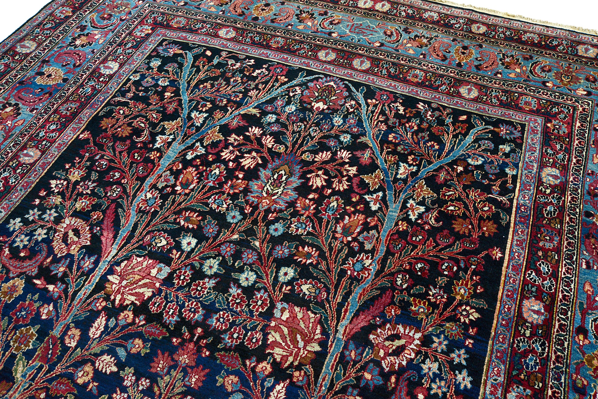 An authentic antique Persian Mashhad carpet, hand-knotted in northeast Iran circa 1915. This elegant piece features a deep indigo-blue field with an intricate all-over floral design, framed by a wide decorative border in warm reds, ivory, and soft blues. The fine drawing and rich natural dyes have aged beautifully, giving the carpet a calm and refined presence.