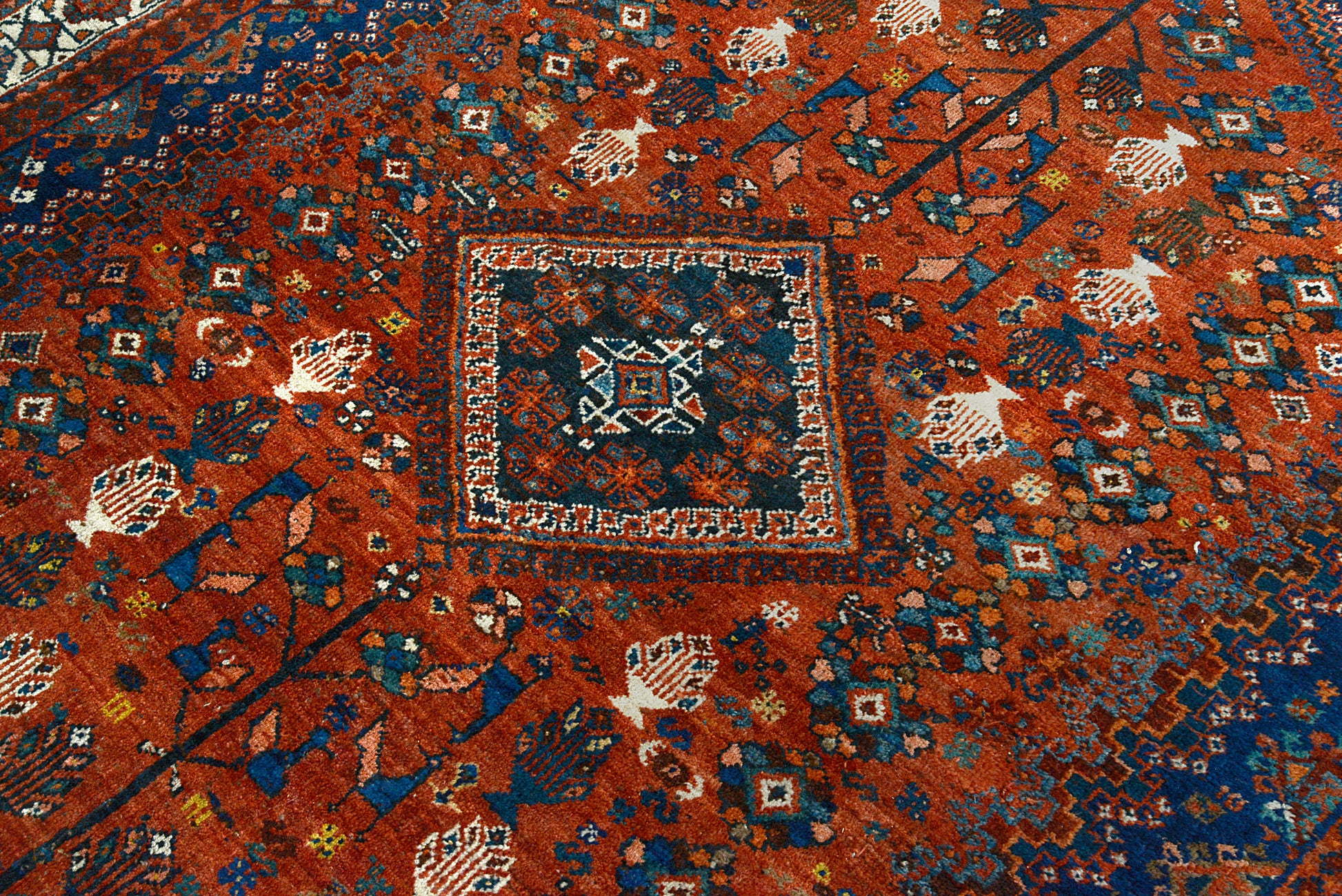 An authentic antique Persian Qashqai carpet, hand-woven by nomadic tribes in southern Iran circa 1920. Featuring a bold central medallion, rich rust-red field, and broad indigo accents, this carpet displays strong tribal character and beautifully aged natural dyes.