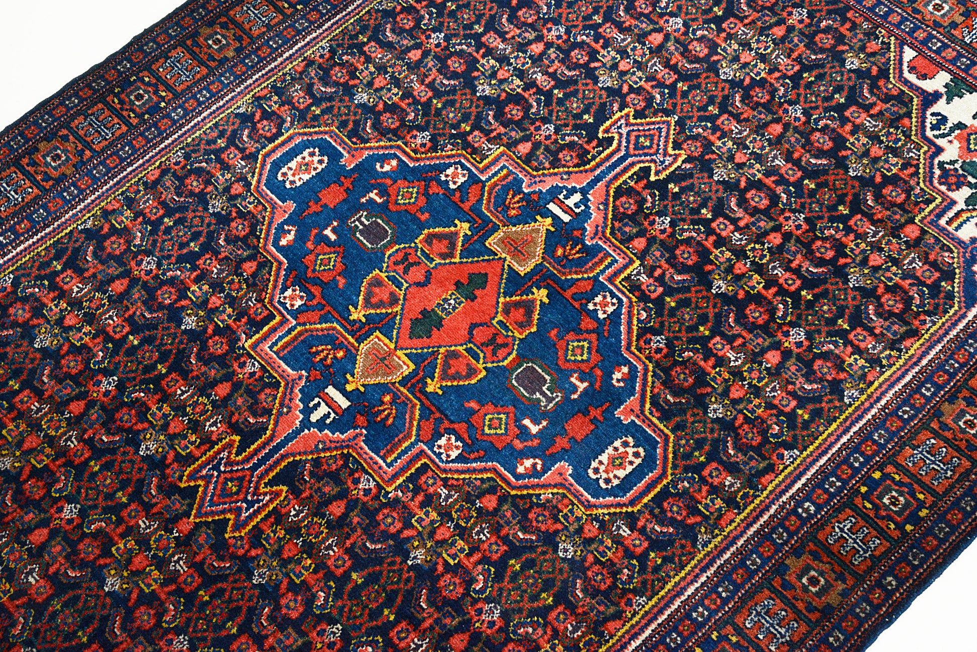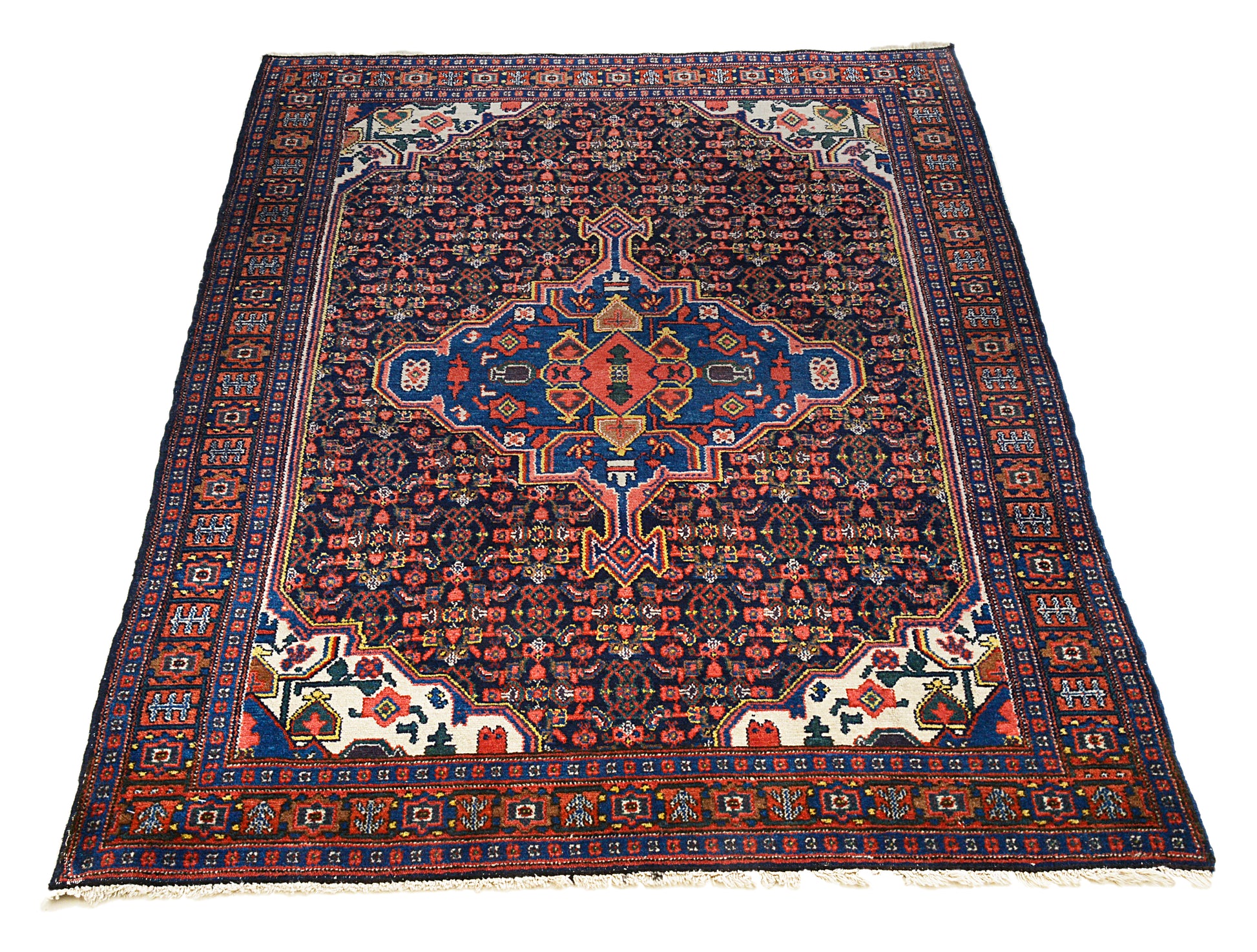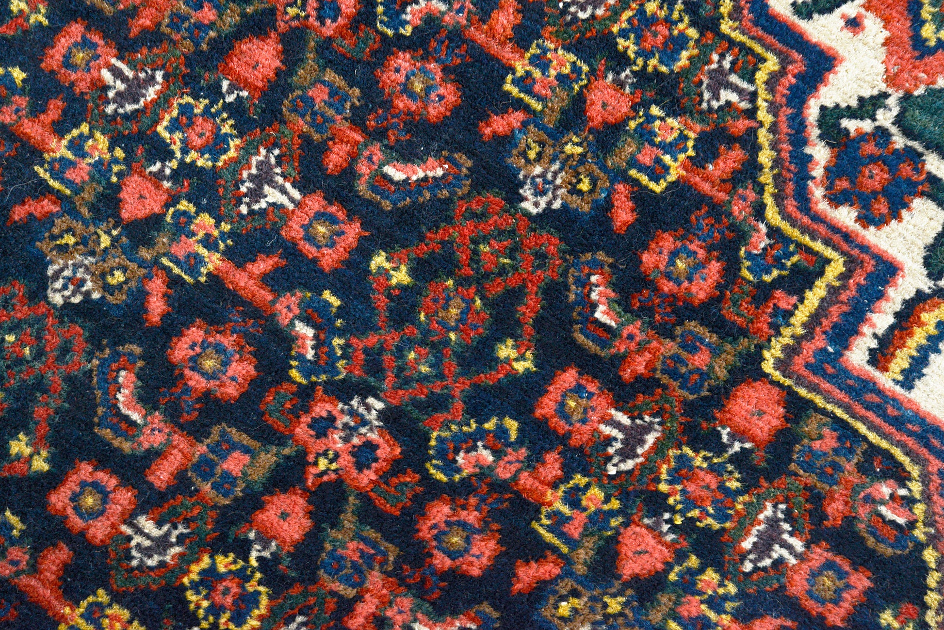An authentic antique Persian Senneh rug, hand-knotted in western Iran circa 1920, is celebrated for its fine weave and intricate geometric patterning. The deep indigo field, enriched with warm reds and soft ivory accents, creates a balanced and sophisticated composition.