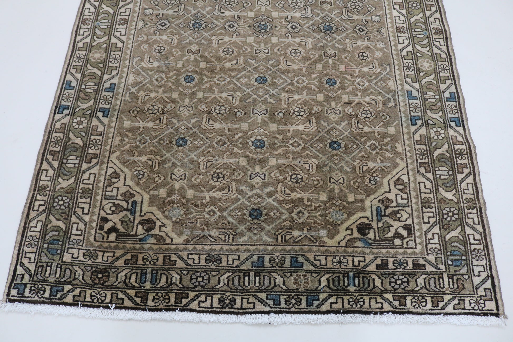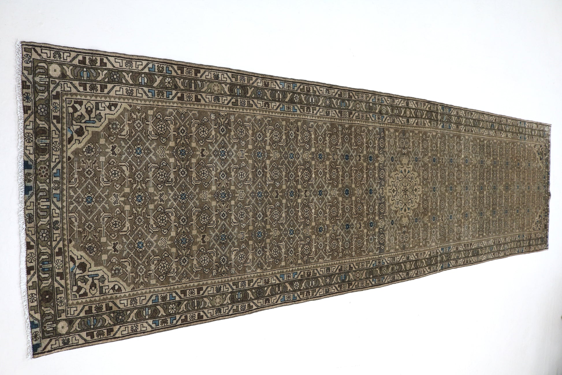 Malayer rugs typically feature intricate geometric patterns, Common motifs include the Herati (fish) , and various stylised floral and animal designs, this Malayer runner has Herati design and nice muted colour pallet which make it elegant and very good furnishing piece.