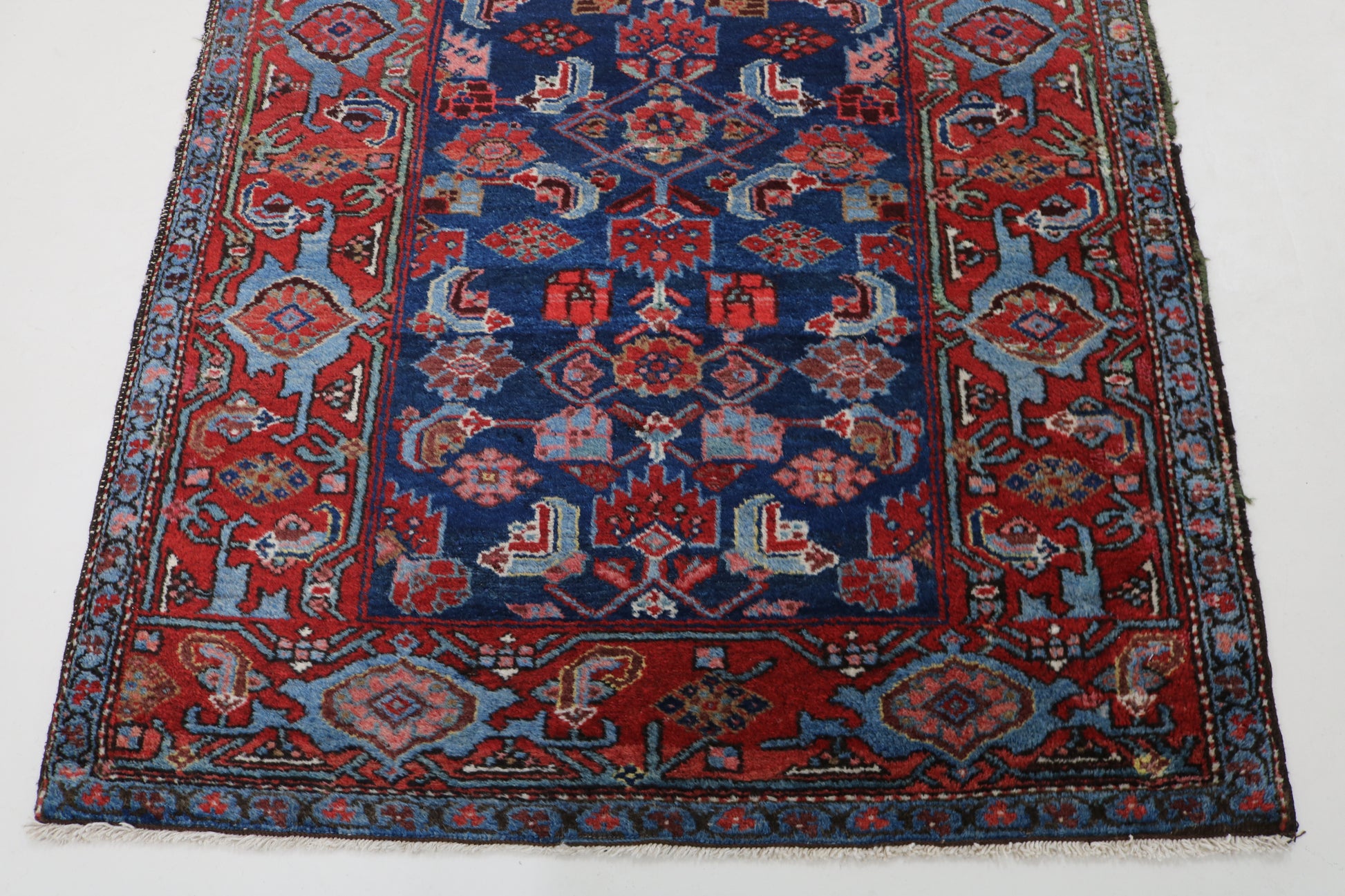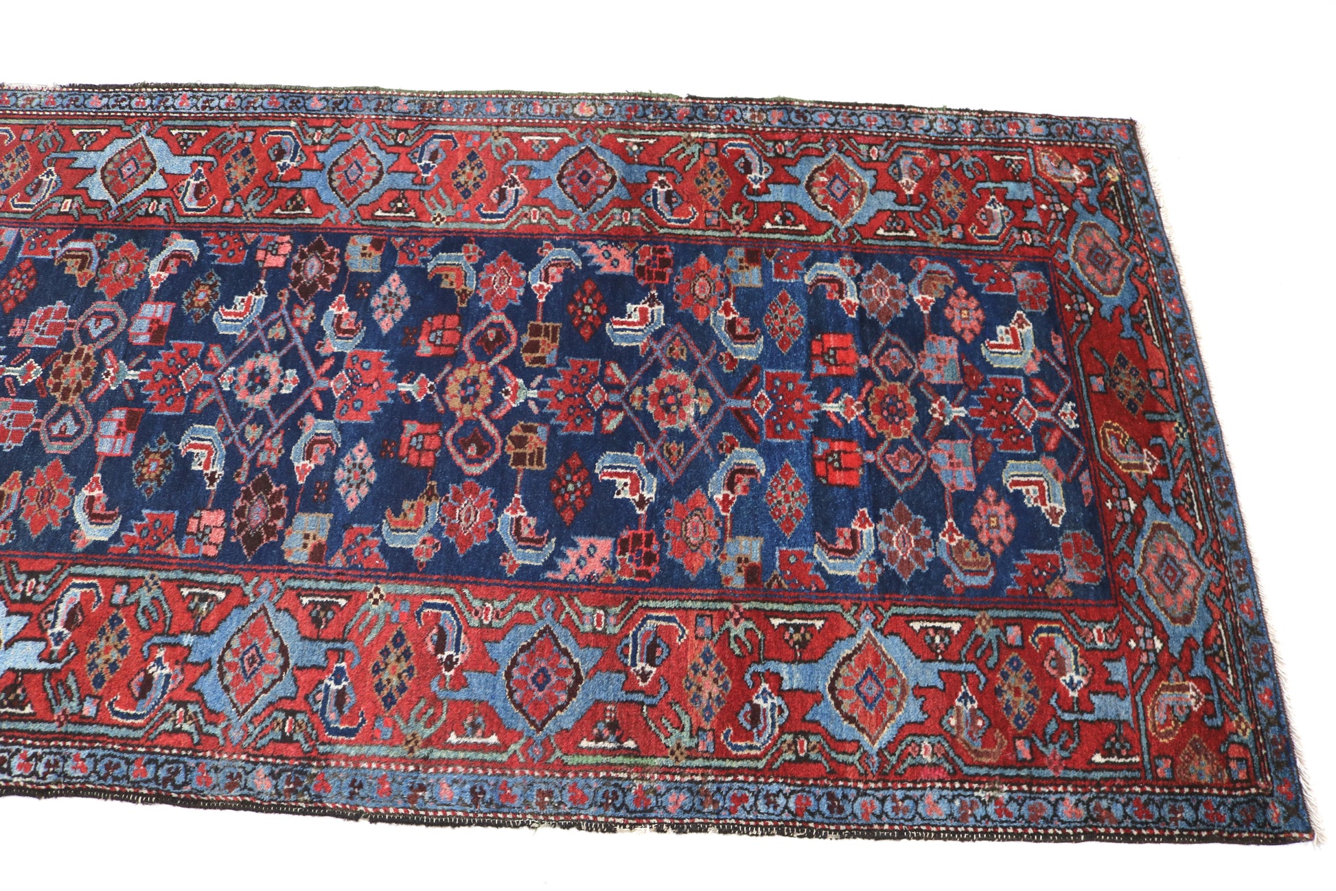 Classic for this type with very well drawn open herati design. Very good colour combination with soft shaded blue field. Elegant border design of stylised ice-blue turtle-palmettes with soft rust background. In general, this carpet has good pile, soft wool quality. Great furnishing piece. Attractive.