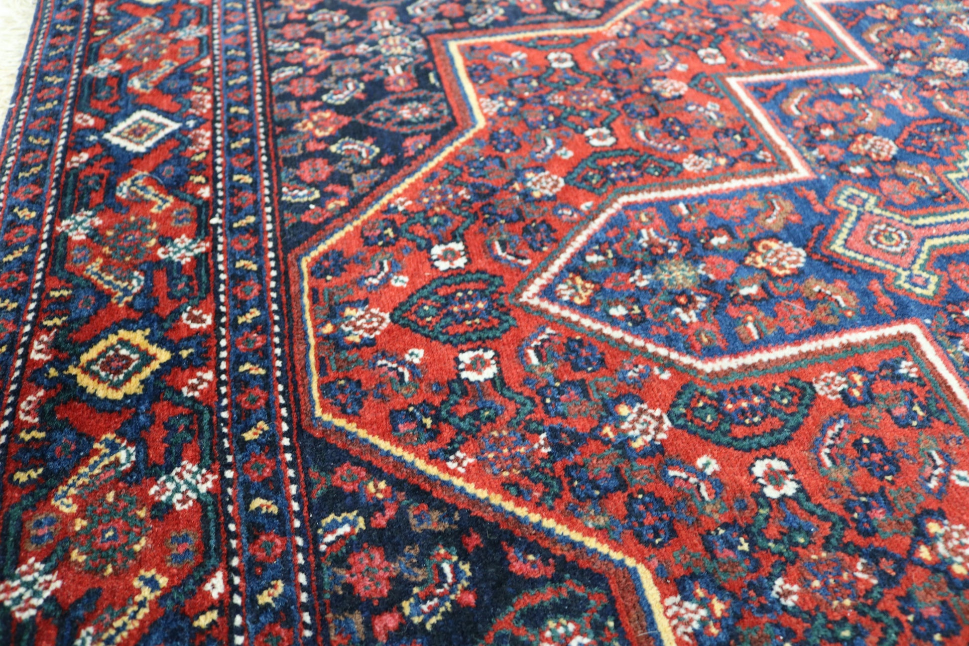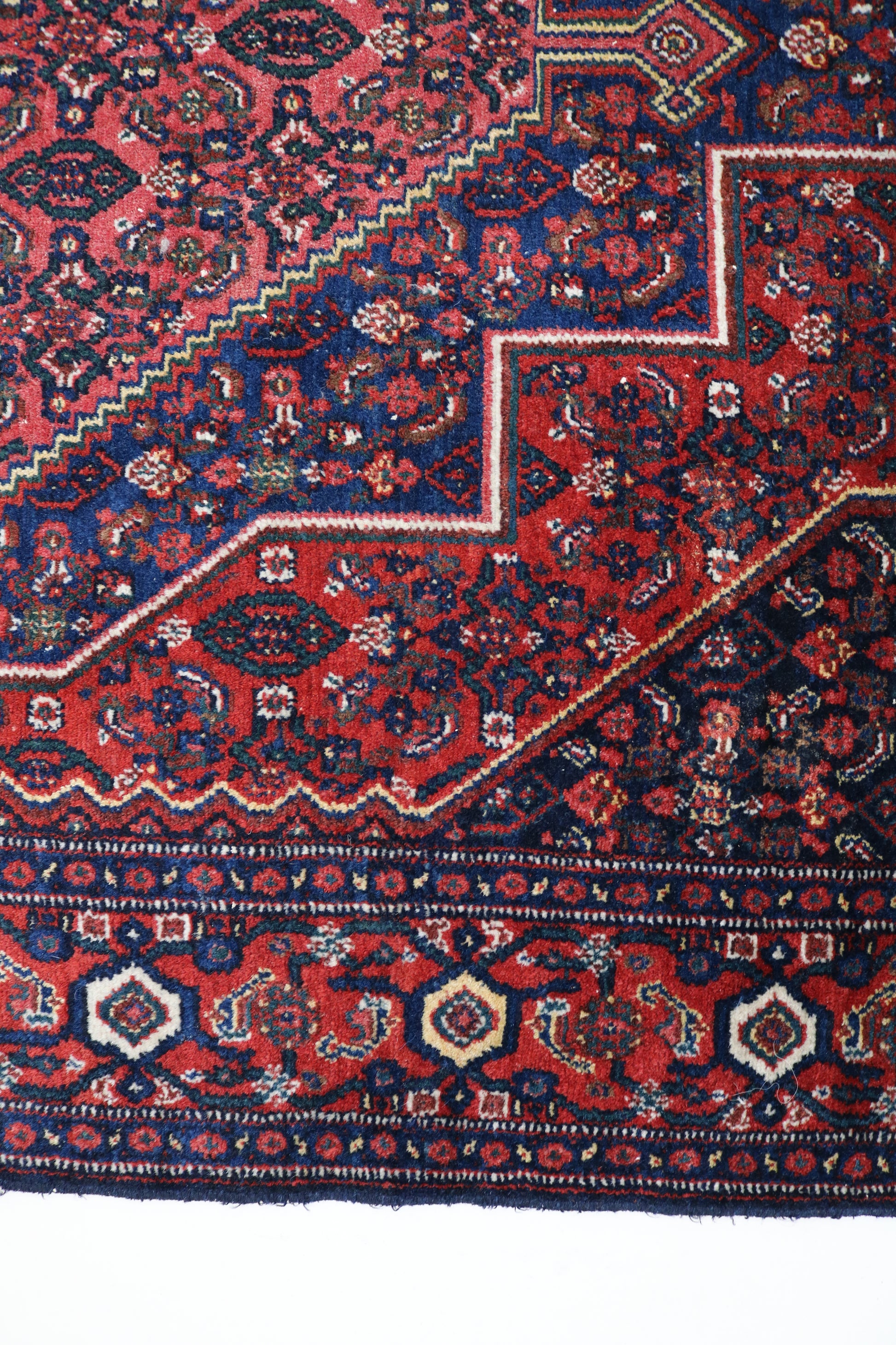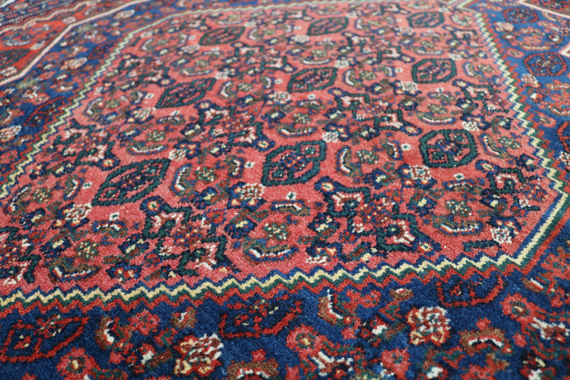 Classic for this type with stylised herati design on soft red, blue and dusty-pink shaped panels. Well balanced colours. Very good border with bold turtle-palmettes between floral stripe Popular and very good furnishing piece.