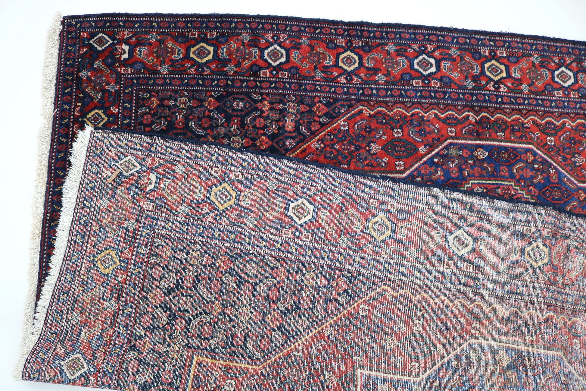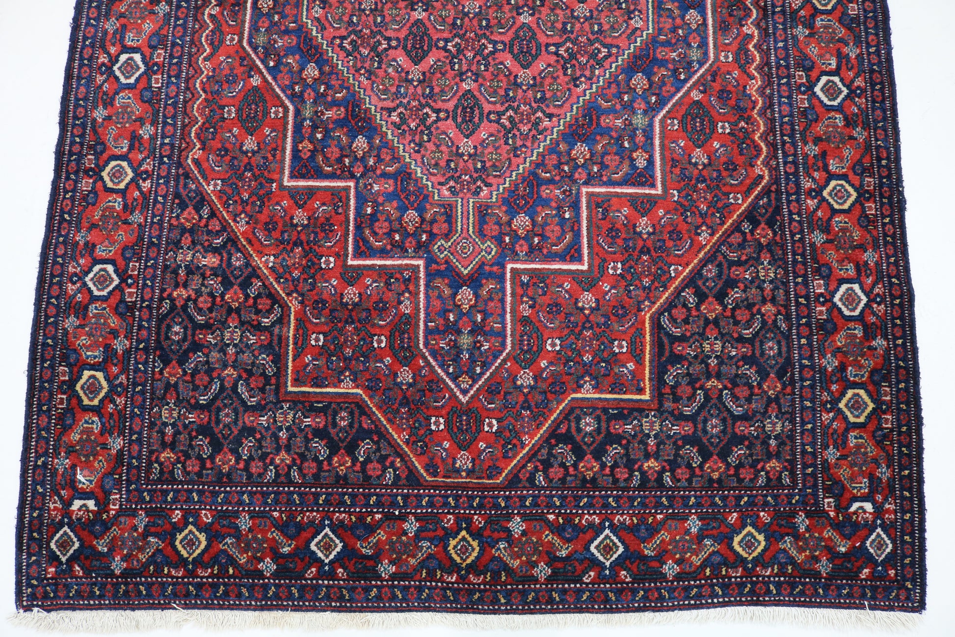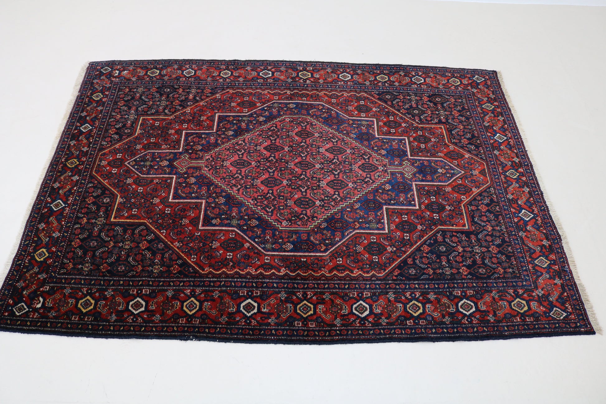 Classic for this type with stylised herati design on soft red, blue and dusty-pink shaped panels. Well balanced colours. Very good border with bold turtle-palmettes between floral stripe Popular and very good furnishing piece.
