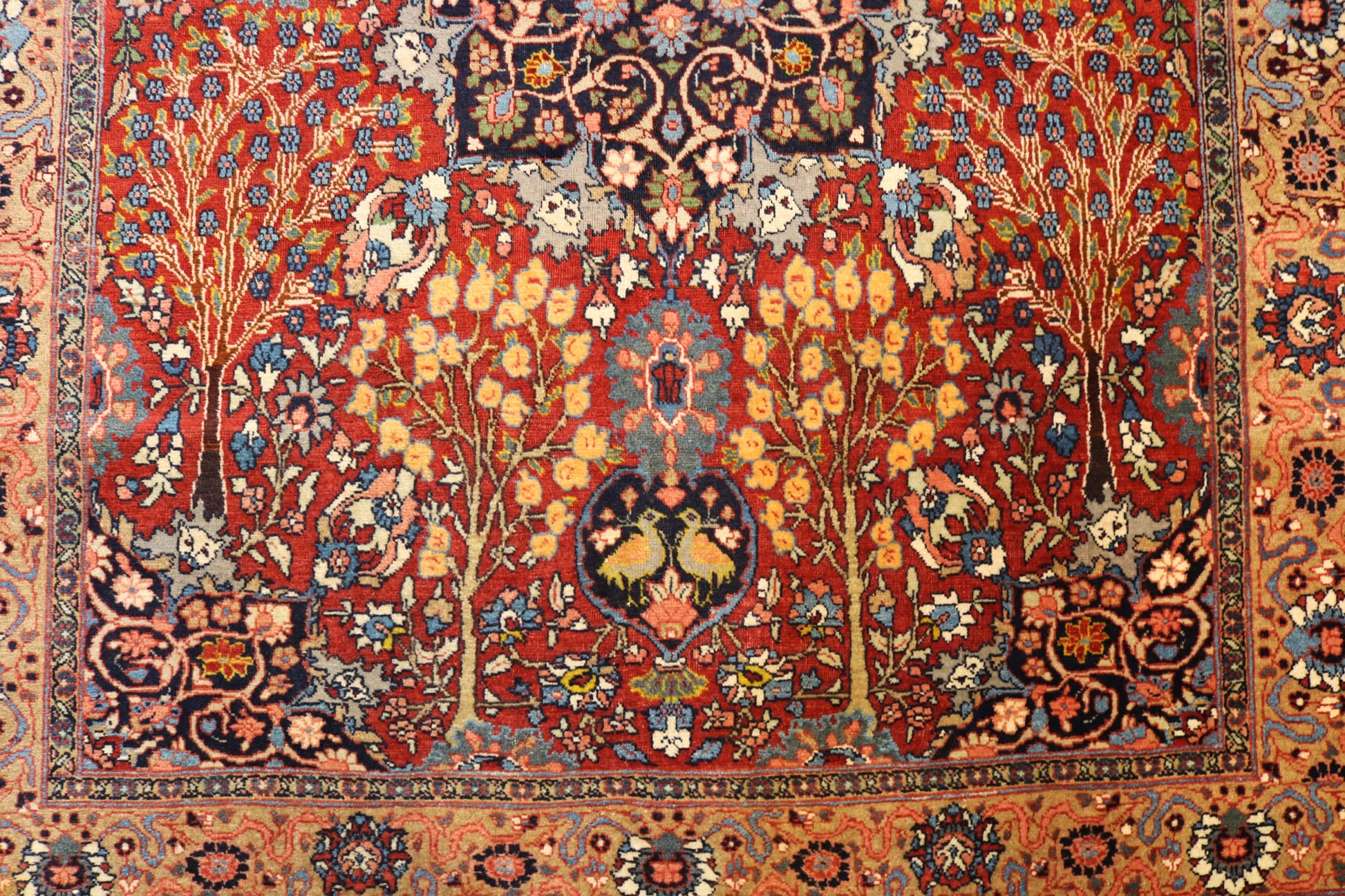Fine antique Tabriz Rug Circa 1920 with detailed trees surrounding a central medallion with depictions of felines and flowers.