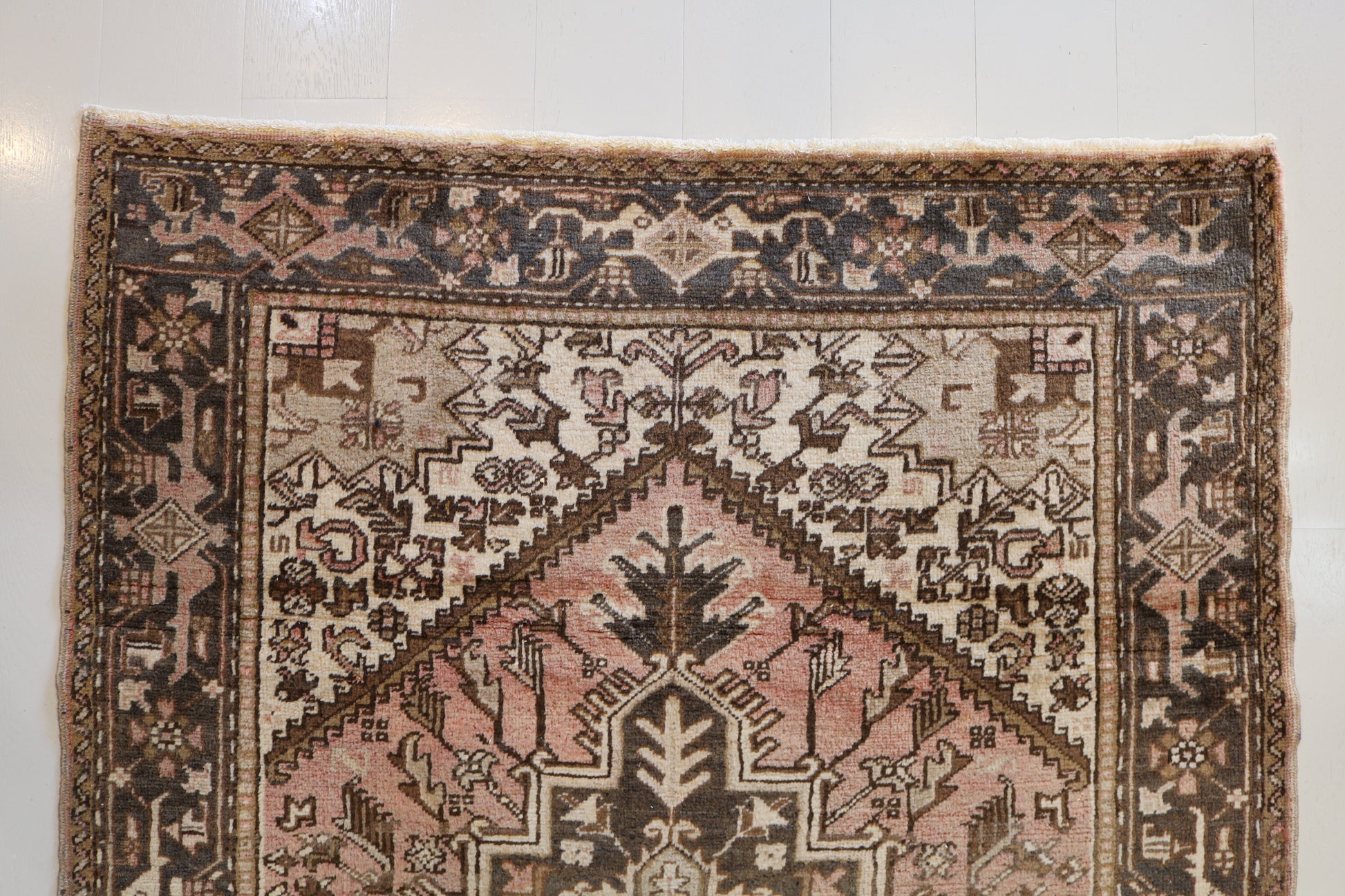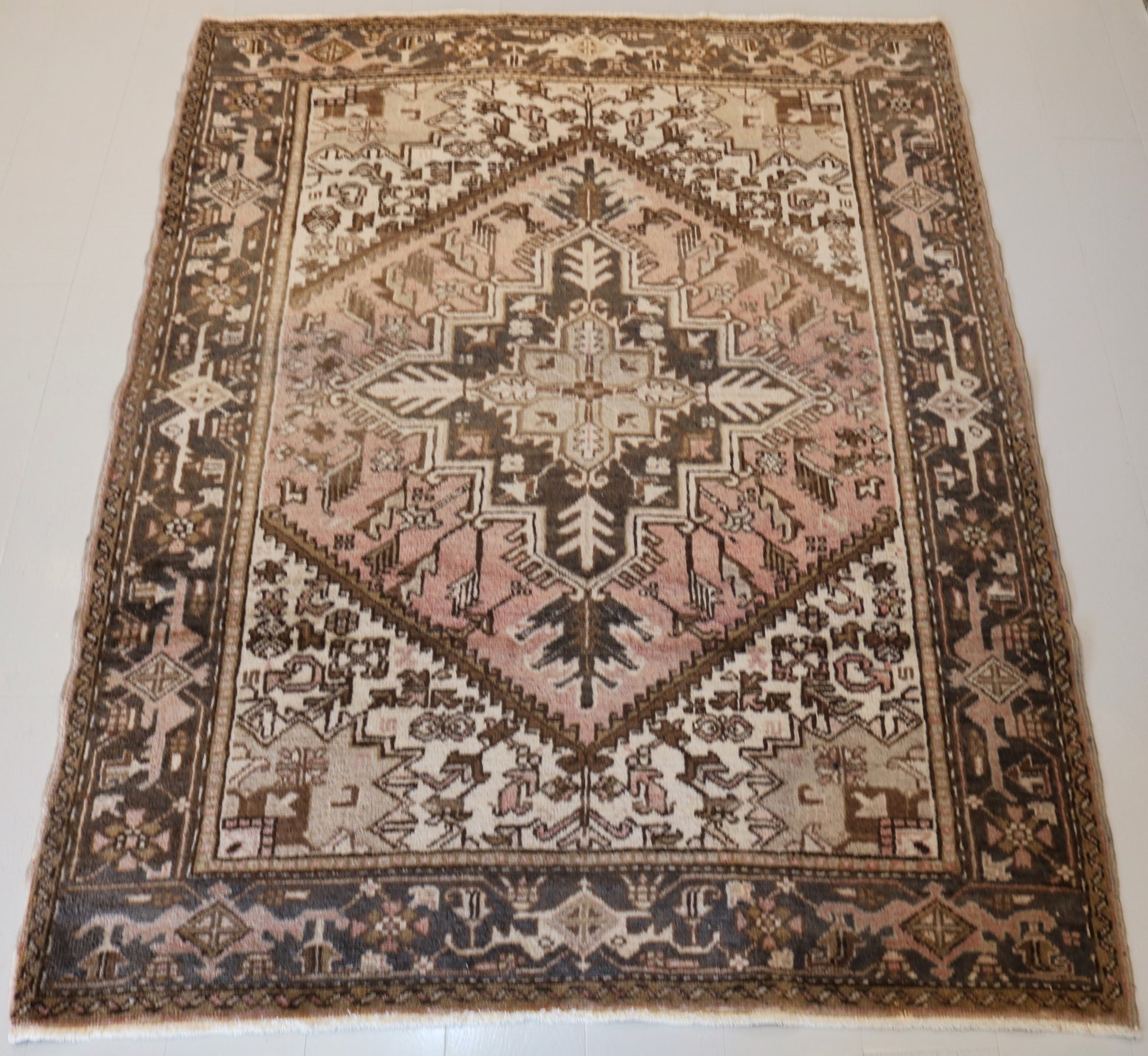 Antique Heriz Circa 1970 with muted tones and the traditional tortoise geometry design on the borders, the medallion with a light  pink colour and the soft blues makes it suitable for any interior.