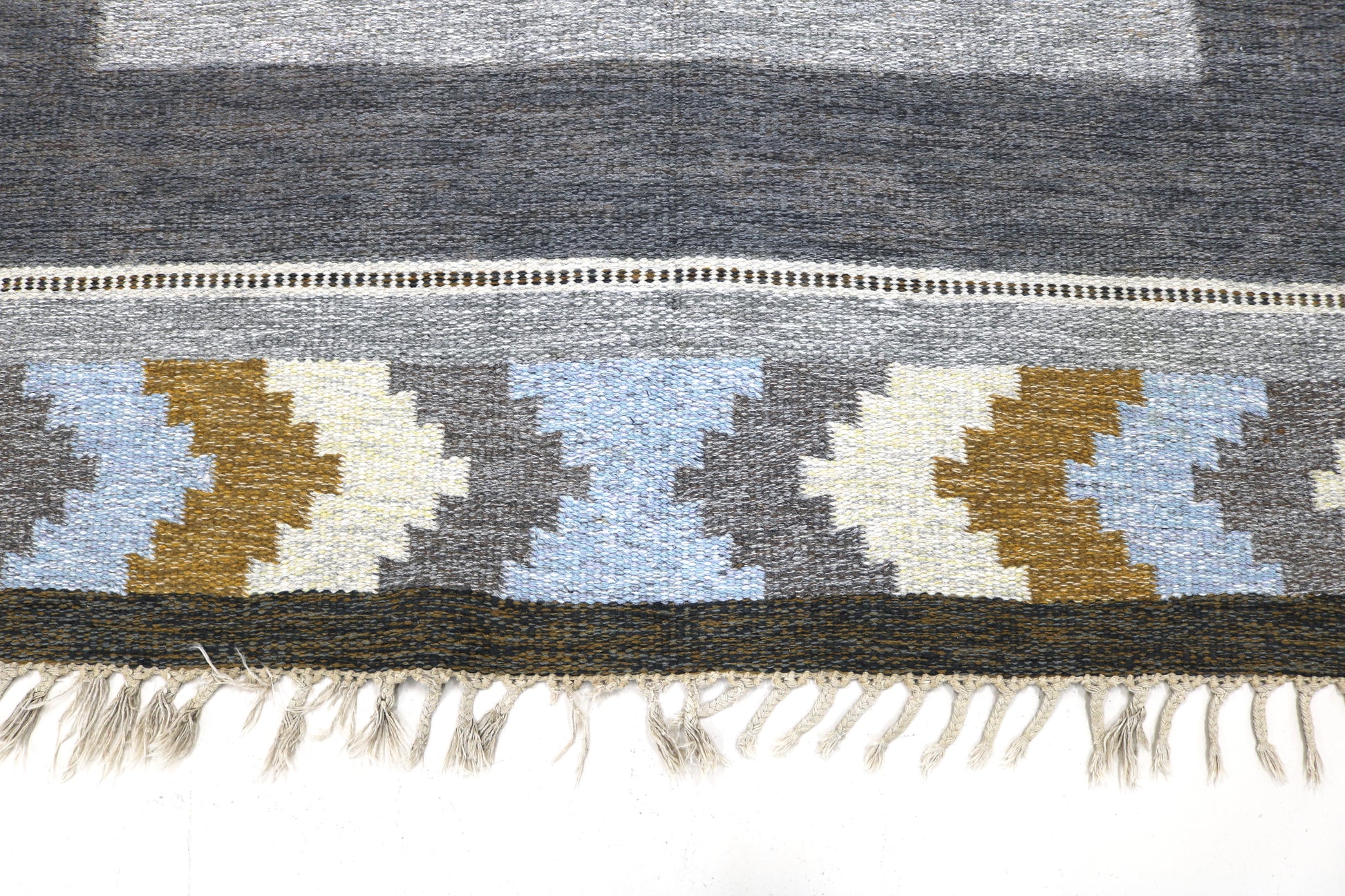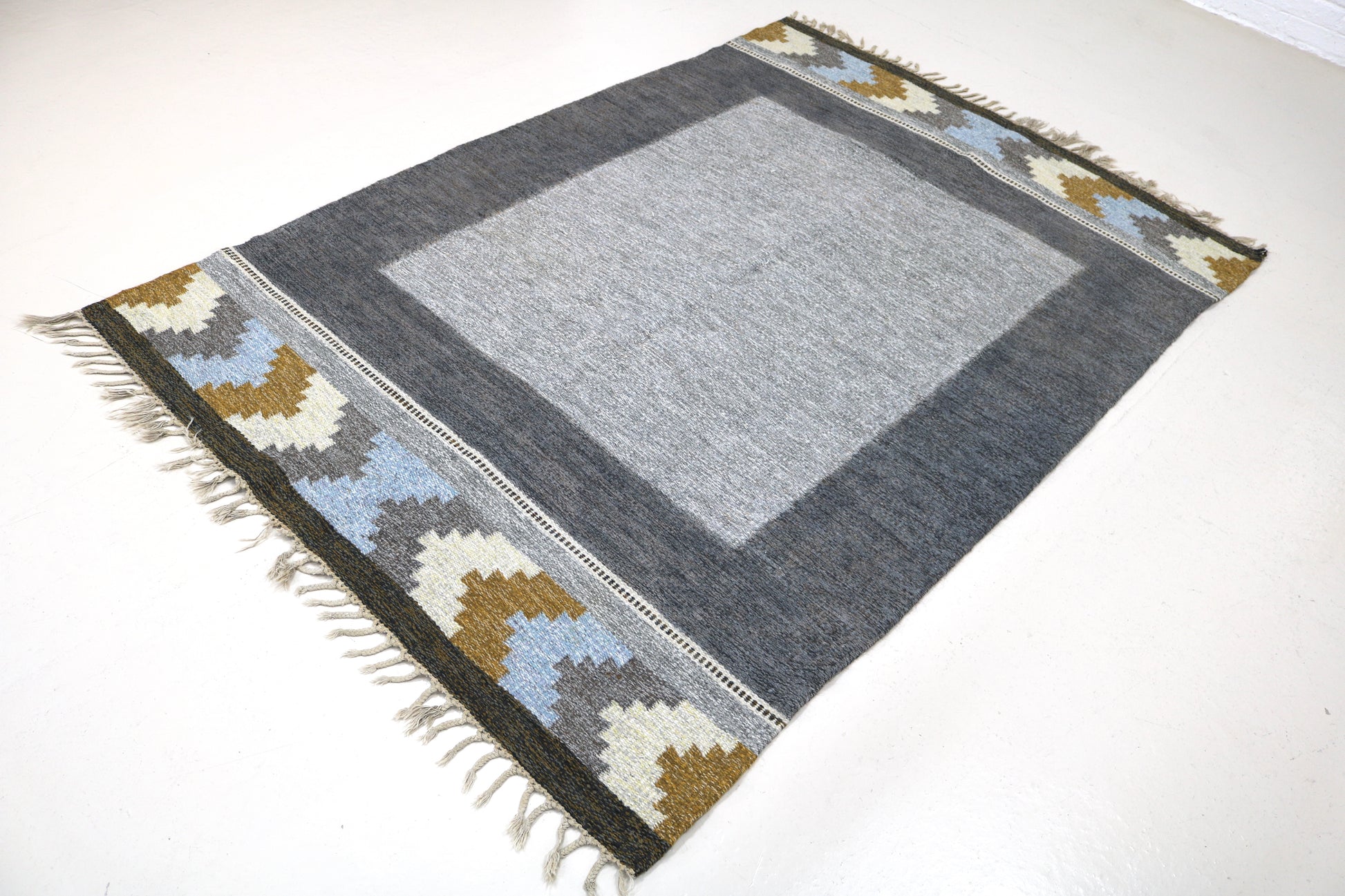 This vintage Swedish Kilim rug dates to the mid-20th century (circa 1950s–1960s) and exemplifies the restrained elegance and functional craftsmanship associated with Scandinavian modernism. Handwoven in wool, the rug features a balanced geometric composition with a muted palette of grey, charcoal, soft blue, ivory, and warm ochre tones—hallmarks of classic Swedish flatweave design.