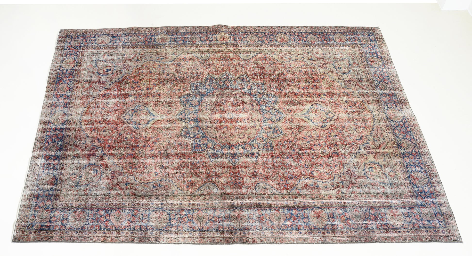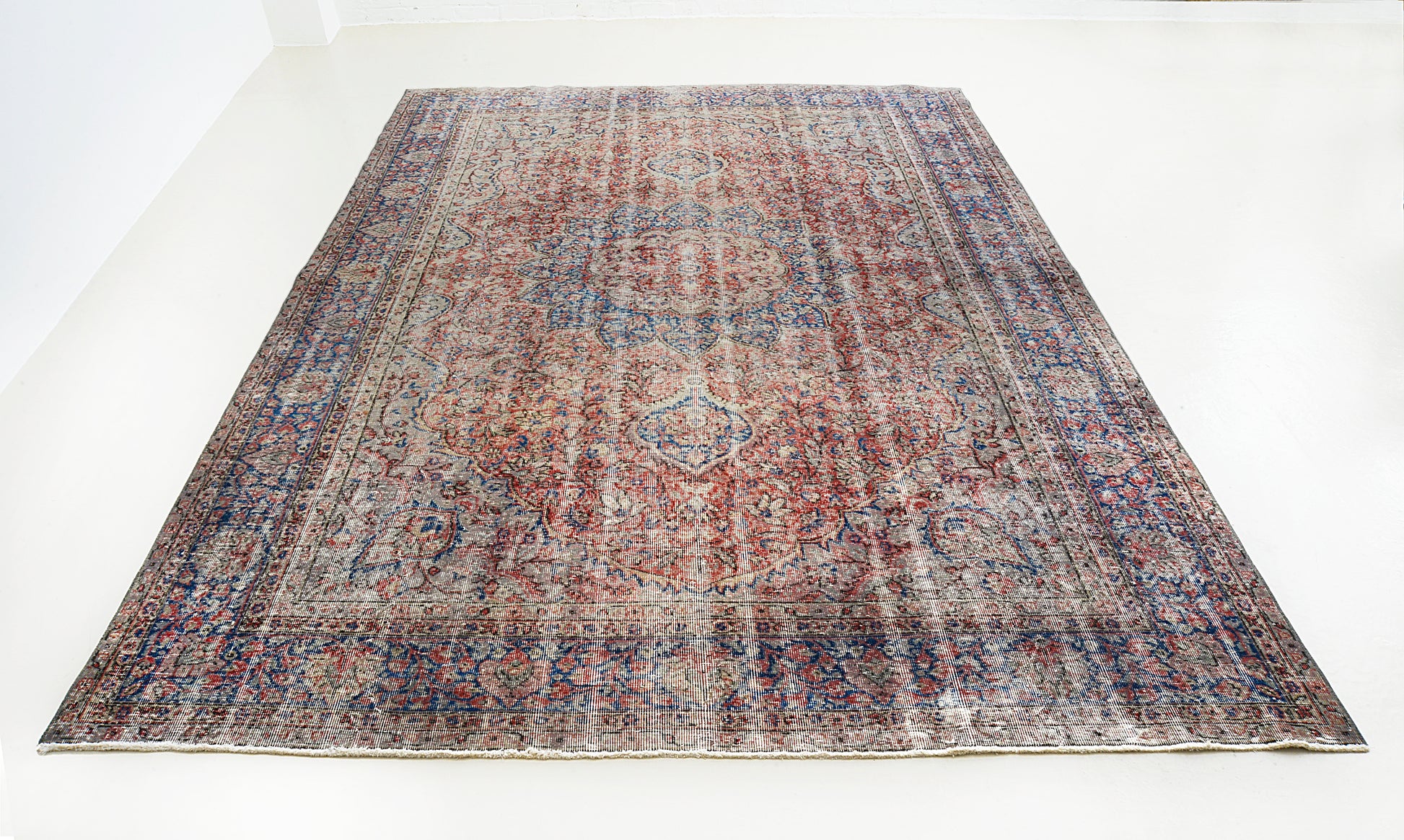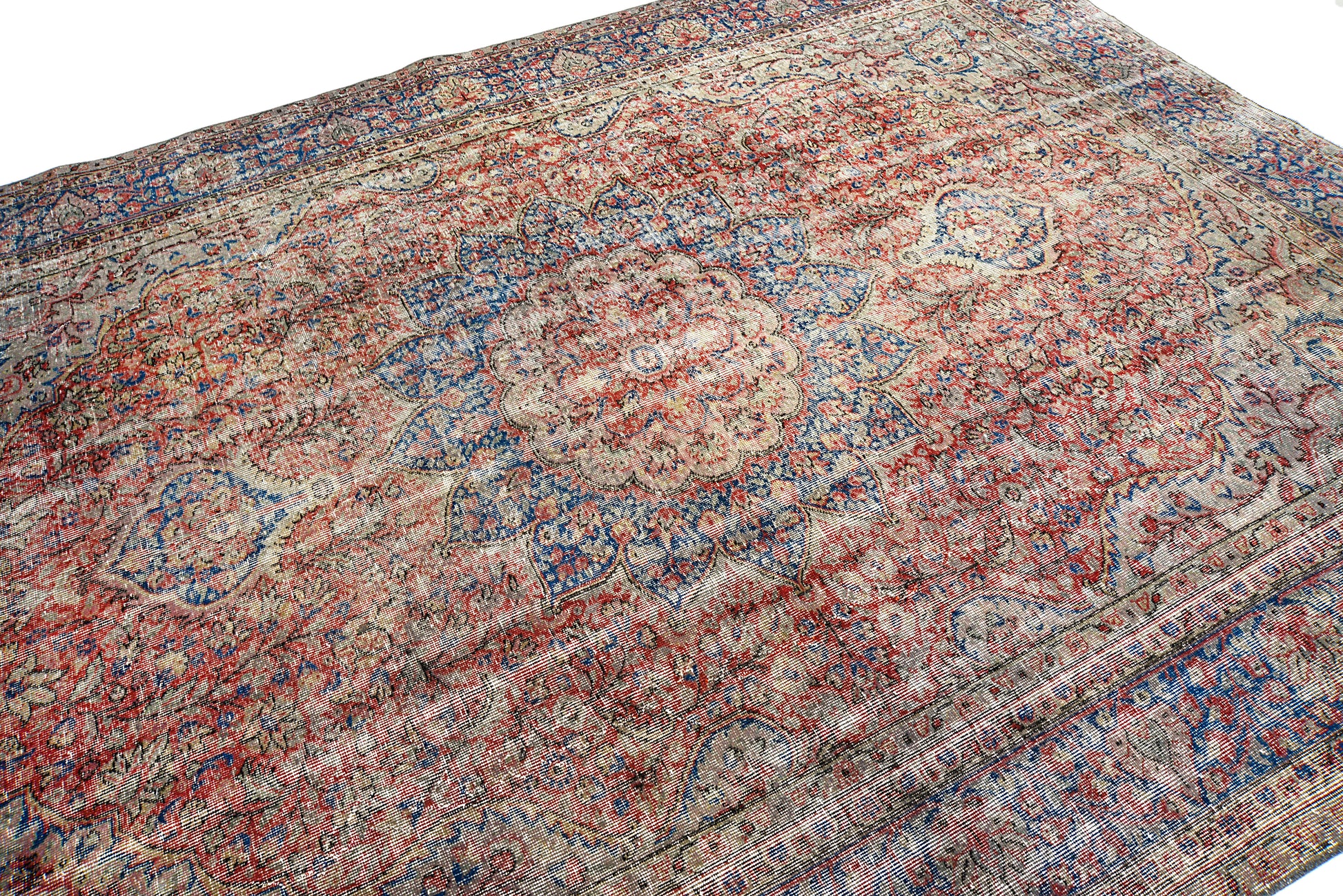 An authentic vintage Turkish carpet, hand-woven circa 1940, featuring a softly faded central medallion and a harmonious palette of reds, blues, and warm neutral tones. The naturally aged wool shows a beautiful time-worn patina, giving the carpet a calm and versatile character.