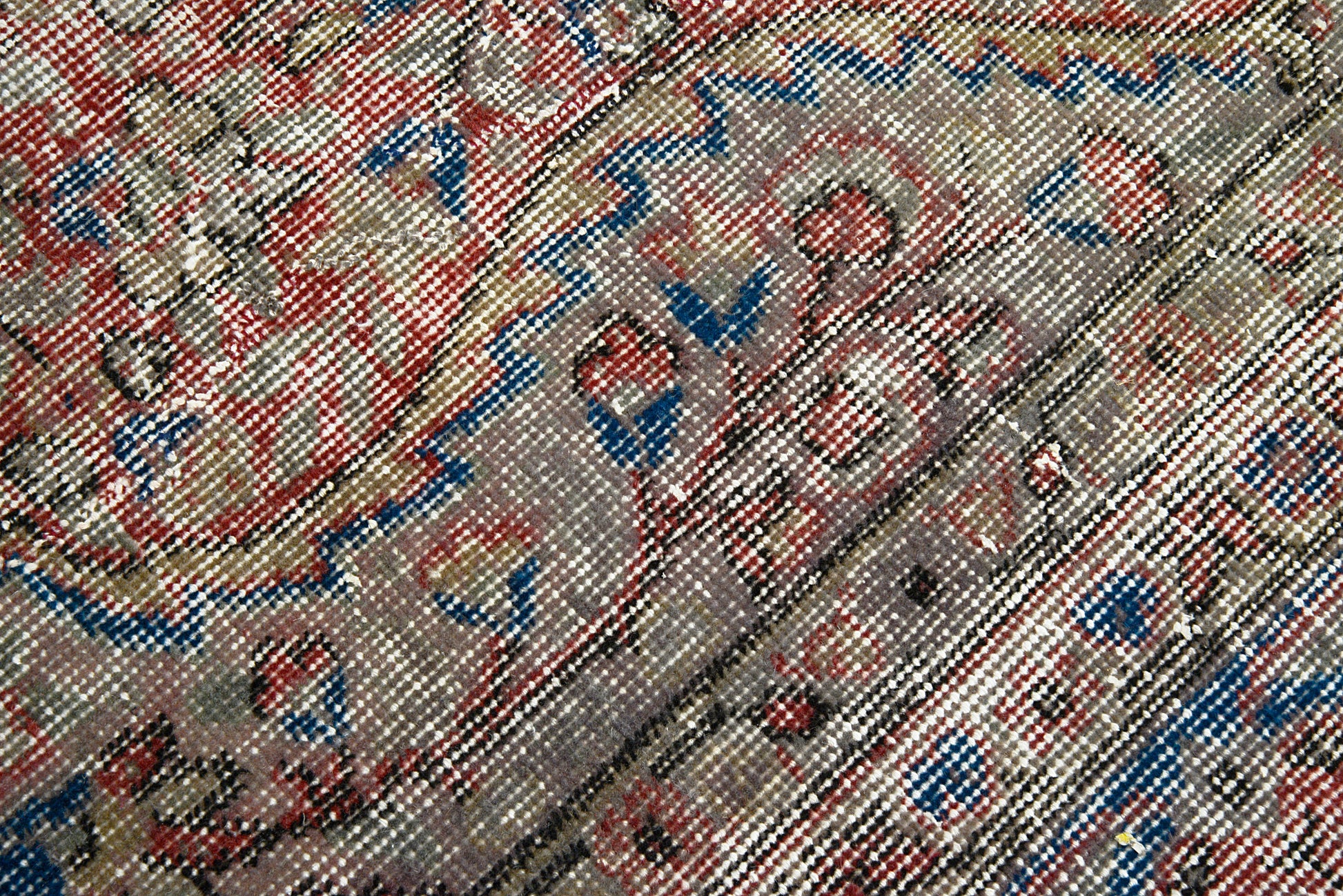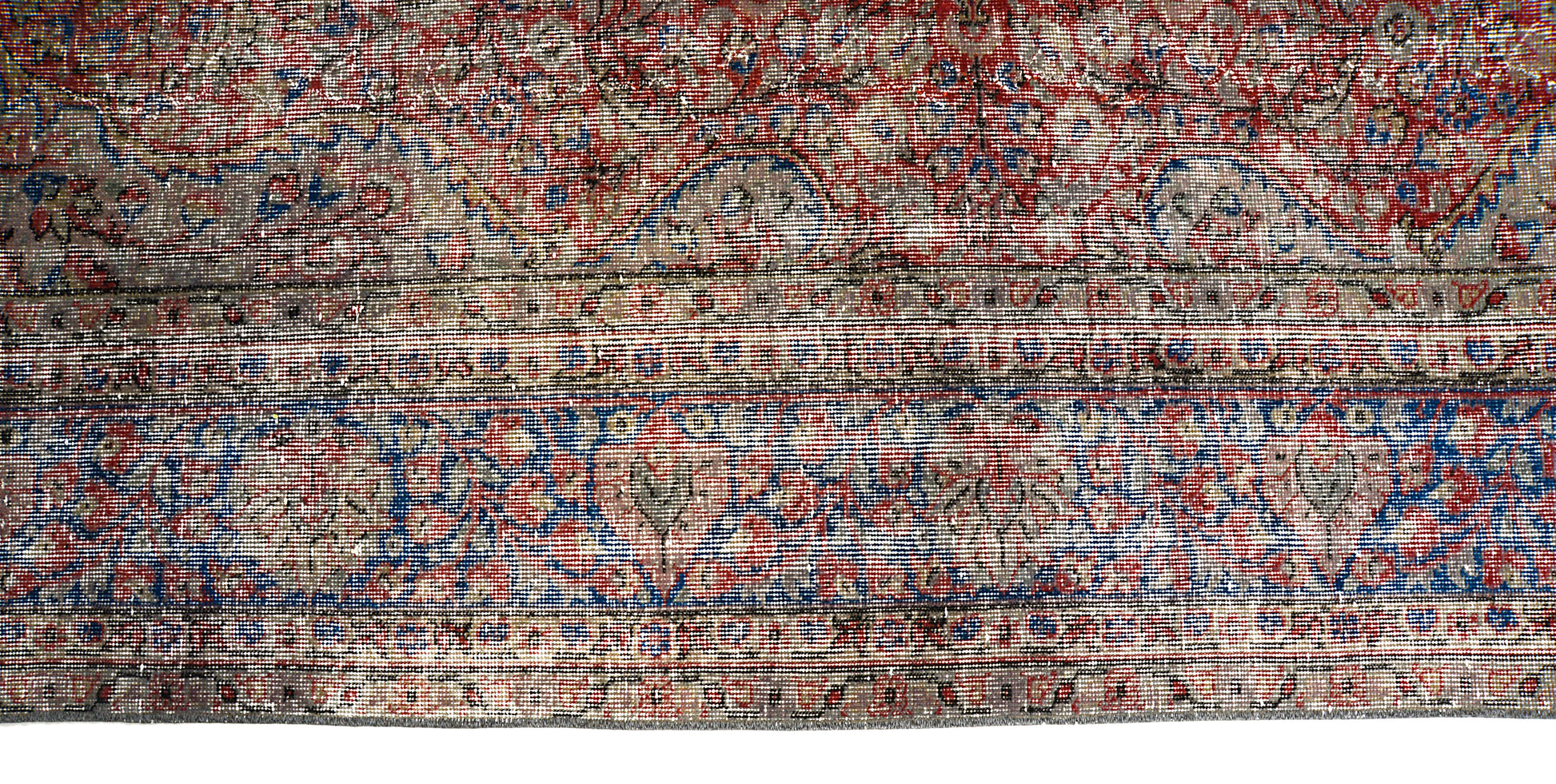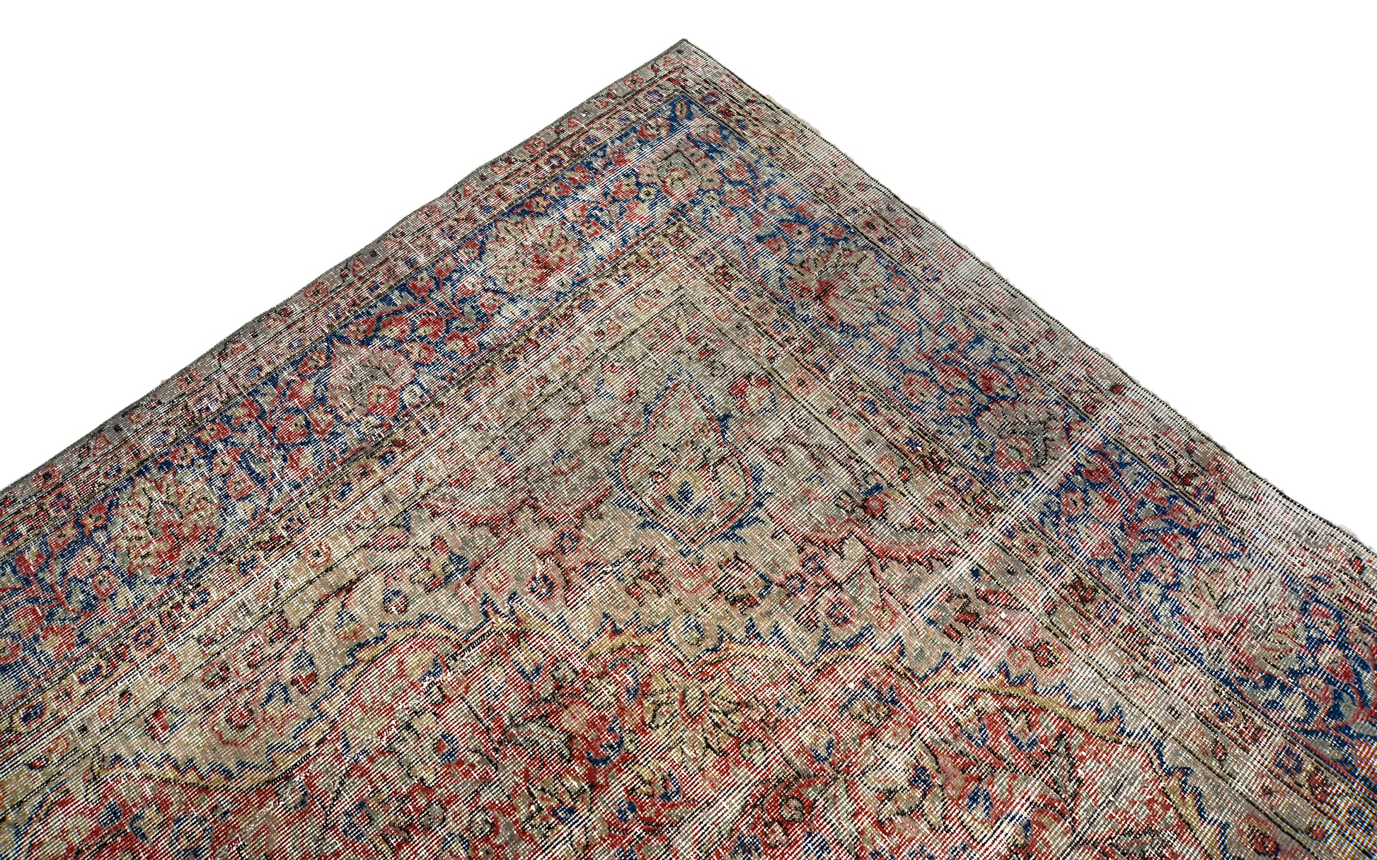 An authentic vintage Turkish carpet, hand-woven circa 1940, featuring a softly faded central medallion and a harmonious palette of reds, blues, and warm neutral tones. The naturally aged wool shows a beautiful time-worn patina, giving the carpet a calm and versatile character.